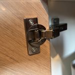 De kast is geschilderd in de kleur Light Peach Blossom en heeft greepjes van messing. Deuren en lades zijn met soft-close uitgevoerd.